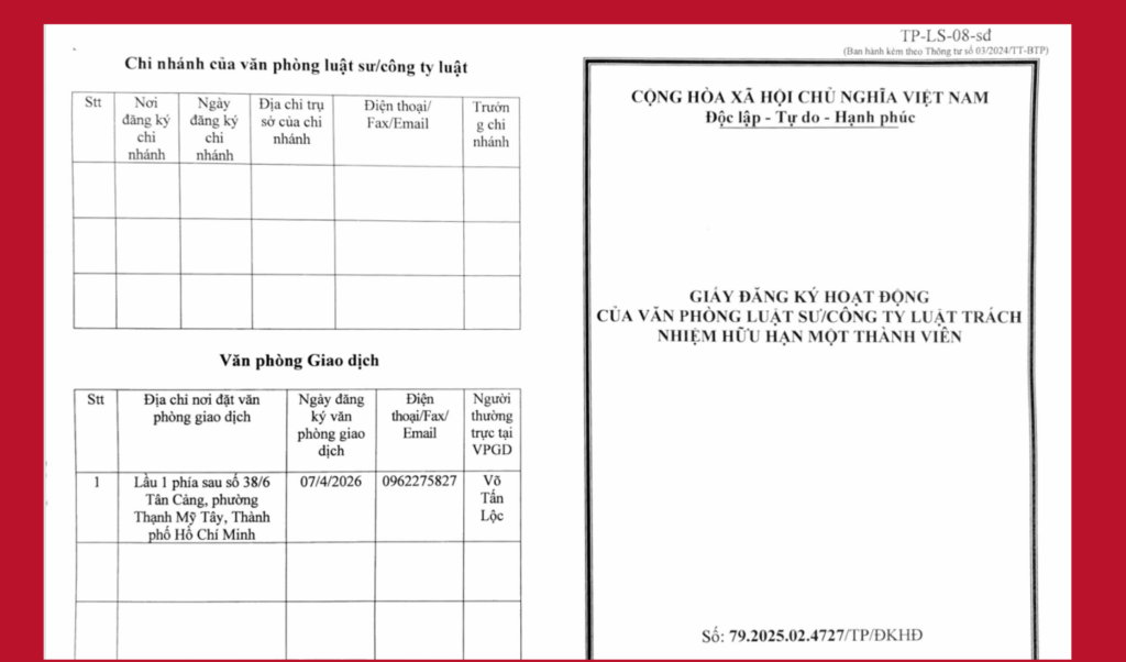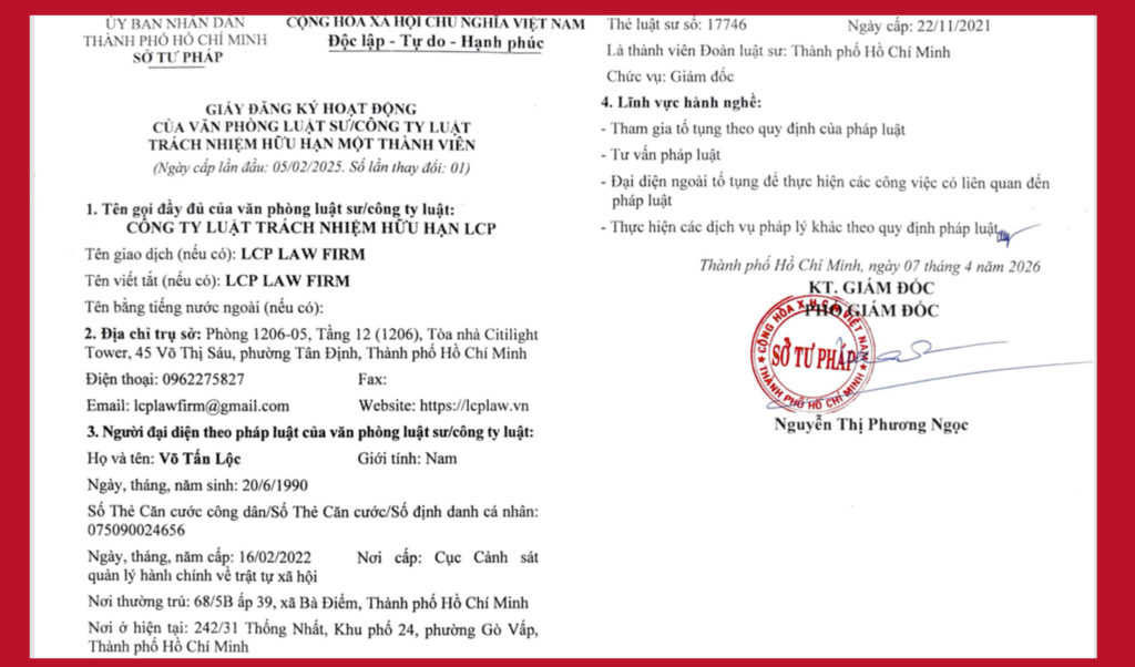 Hồ sơ pháp lý Công ty Luật LCP, Gi ấy phép đăng ký hoạt động được cấp lần đầu vào ngày 05/02/2025, được thay đổi lần đầu vào ngày 07/4/2026